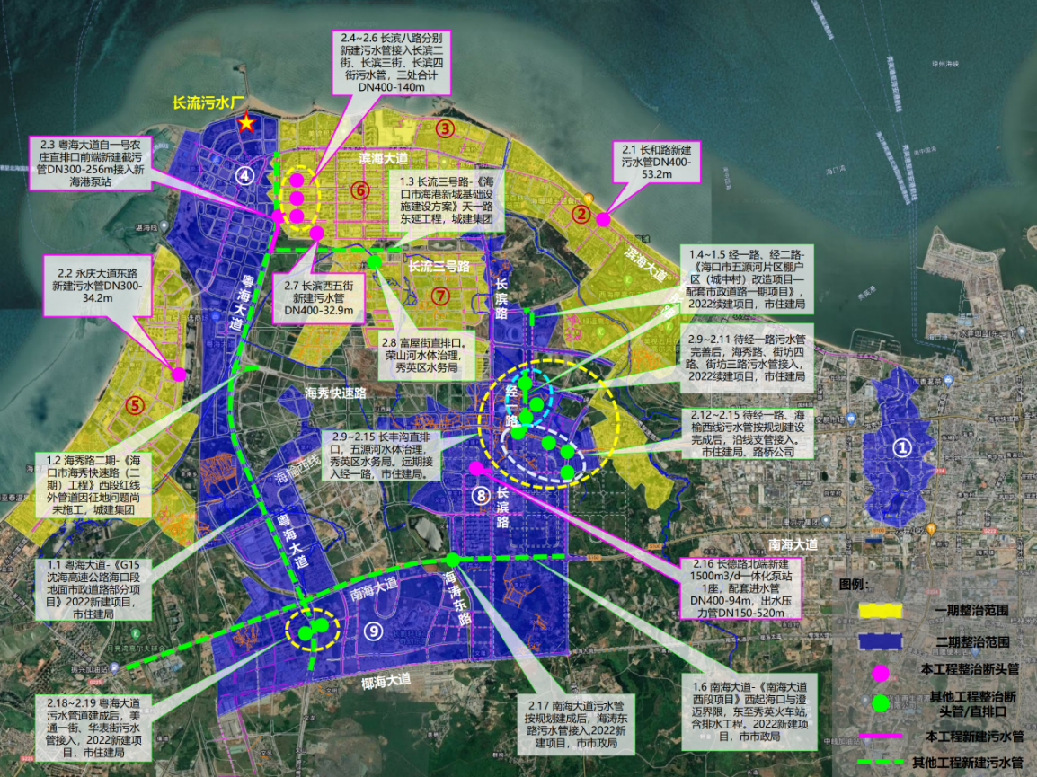 长流污水厂系统提质增效“一厂一策”项目(一期) 该项目建设范围为长天路以西、盈滨路以东、椰海大道以北、琼州海峡以南的区域,以及秀英沟片区,主要建设内容为污水水质......