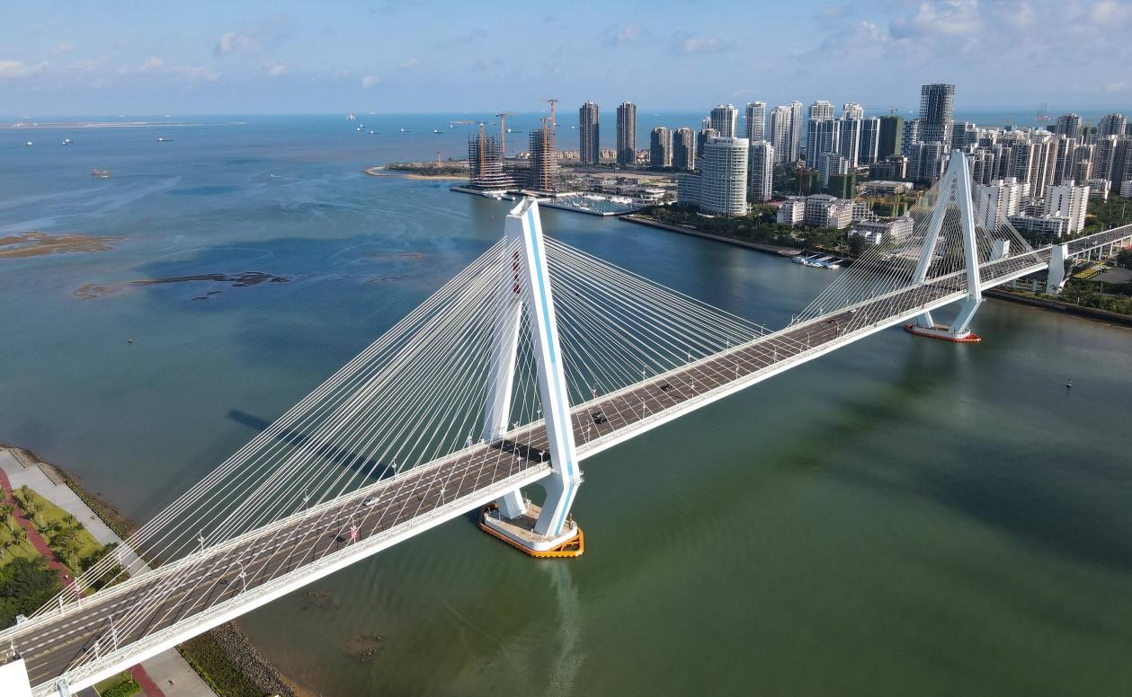 该项目位于海口市龙昆北路北延长线上,跨越海甸河入海处,全长2681.9米,全部桥面为六车道,主跨下最高水位4米,通航净高为24米,可安全通行3千吨级的轮船。主桥两端共设四座八层塔楼,集观光、管理、商务功能于一体,造型简洁、明快,极具现代感。世纪大桥的建成有效化解了人民桥、和平桥的沉重负荷,从而整体改善了海口市中心城区的环境质量,是海南省海口市境内的跨海通道,是“九五”期间的国家重点工程,也是海口市的标志性建筑之一。