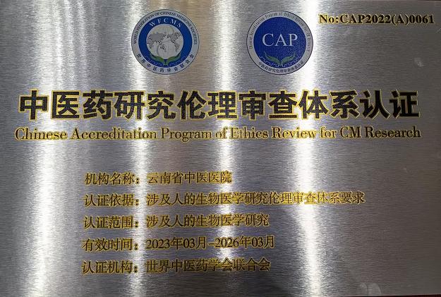 2023.11.0691成人 伦理审查体系顺利通过中医药研究伦理审查体系(CAP)认证,获得CAP认证证书及牌匾。