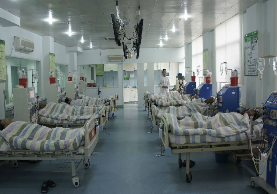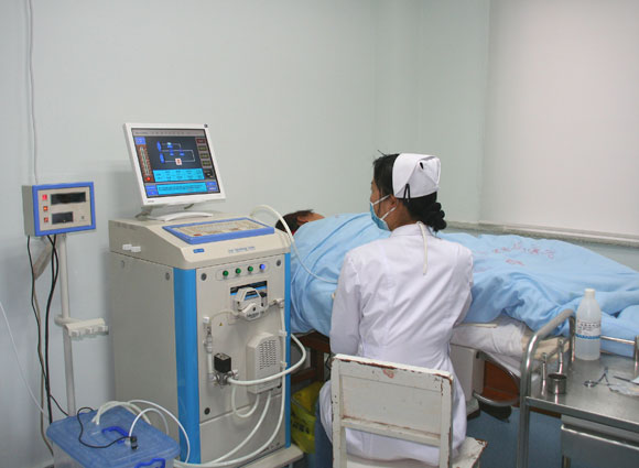 血液净化室配有国费森尤斯、金宝、百特等血液透析机多台及瑞典金宝水处理系统。能开展急、慢性肾功能衰竭、急性中毒、严重水与电解质代谢紊乱及酸碱失衡等疾病的血液净化治疗,可以满足血液透析、血液滤过、透析滤过、血液灌流等常规及特殊透析要求,同时配置心脏、血压监护系统以保证临床监护和医疗安全的需要。